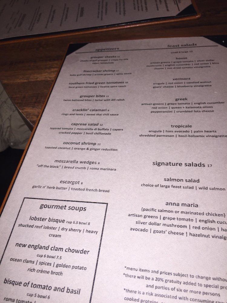 The Feast Restaurant is a casual dining spot located in Holmes Beach, FL, offering a delicious menu featuring pizzas, burgers, and seafood. With options for vegetarians, this restaurant provides a variety of salads like the Feast Salads with unique ingredients like gorgonzola blue cheese and sundried tomato vinaigrette. The Signature Salads, such as the Anna Maria with chevre goats' cheese and hazelnut vinaigrette, are sure to impress. The restaurant also offers the option to add protein like Gulf Shrimp or Crab Cake to your salad. With amenities like outdoor seating, waiter service, and beer and wine options, The Feast Restaurant is a great choice for lunch or dinner with friends and family. Make sure to try their salmon salad with your choice of preparation for a delicious and satisfying meal experience.